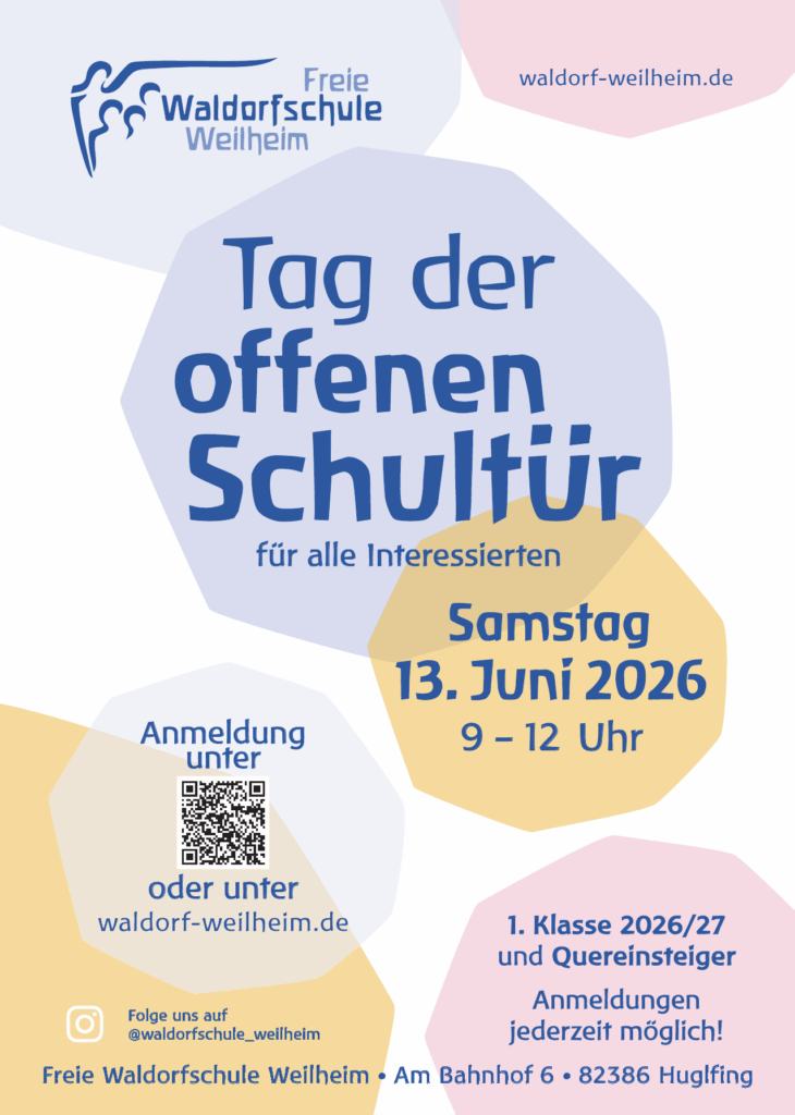 Der Tag der offenen Schultür findet am 13. Juni von 9-12 Uhr statt. Wenn Sie kommen möchten, ist eine Anmeldung notwendig. Bitte schicken Sie dazu eine E-Mail mit Ihrem Namen und dem Betreff „Anmeldung zum Tag der offenen Schule“ an unsere E-Mail Adresse info@waldorf-weilheim.de